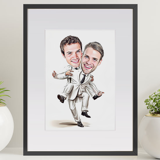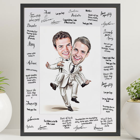 Our Wedding Caricature Guest Signing Frame – 2 guys is a really fun and unique personalised caricature signing board for a wedding. Please note: When you order we will replicate the design you see in the large image. Your artwork will also have the gentleman wearing the suit holding the gentleman in a suit. You can choose the suit and tie colours. We will redesign the picture so it has your friend’s heads instead. Frame Size: (450mm x 555mm). Includes a beautiful mounted frame that can be free standing or wall mounted. The frame comes with glass. The glass will have to be removed, with caution, when the guests are signing the frame.
